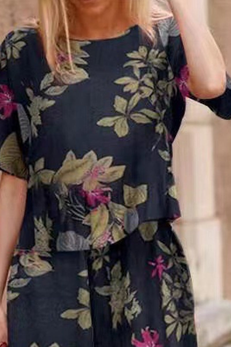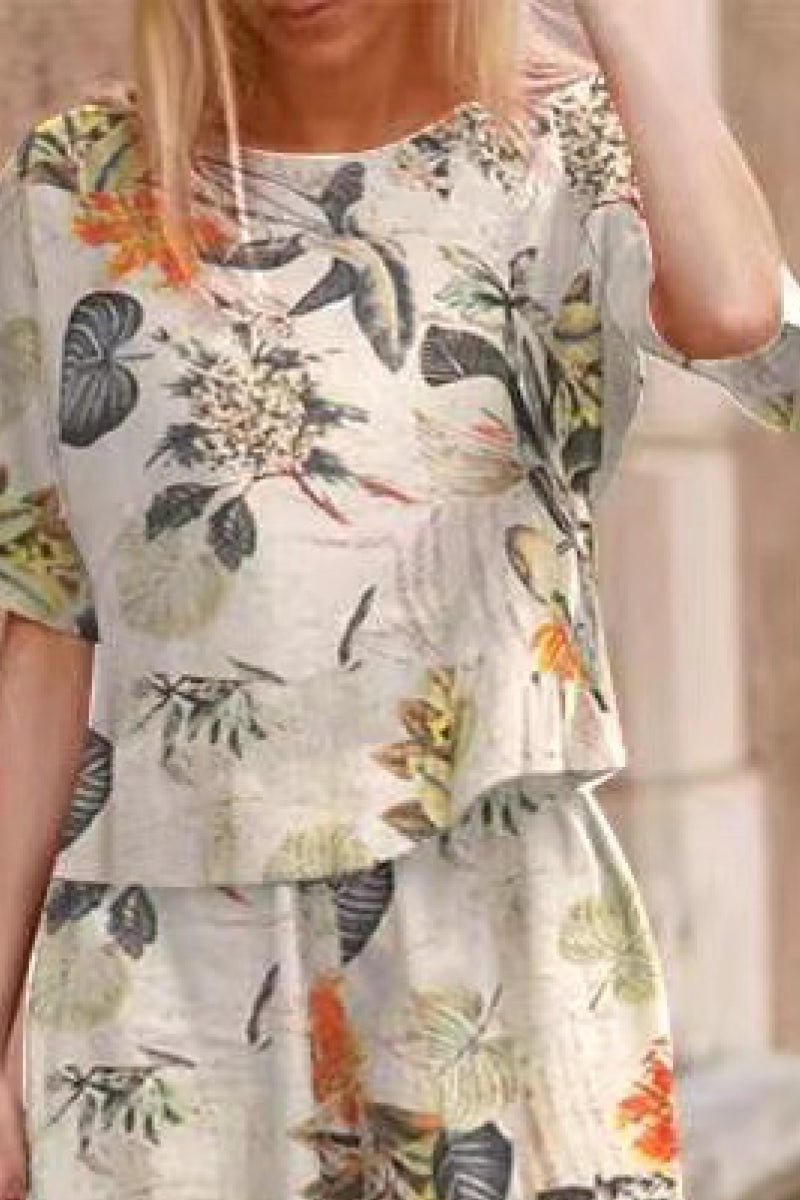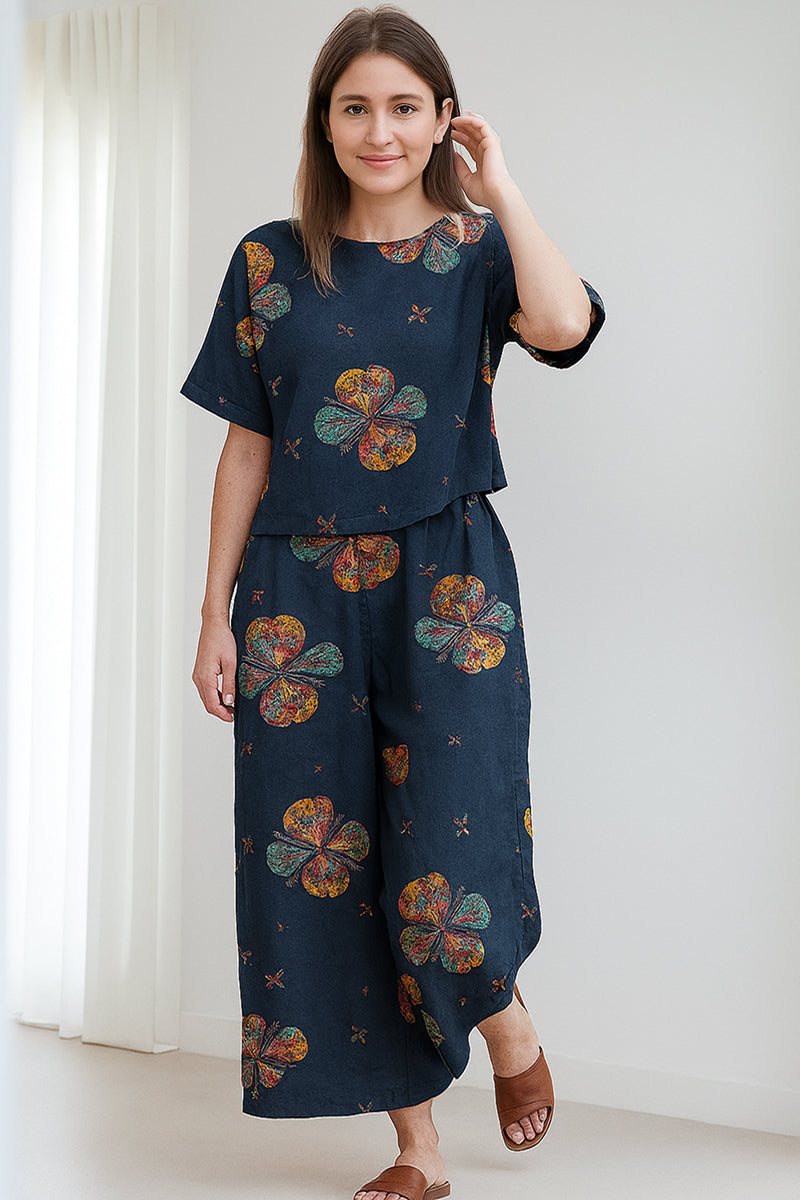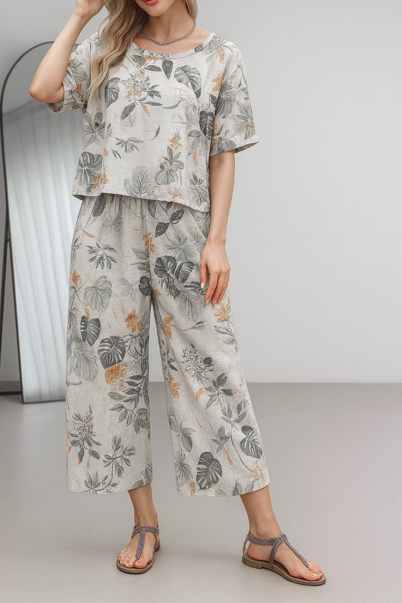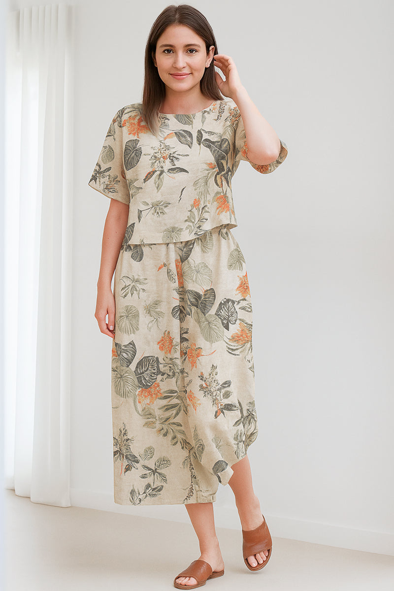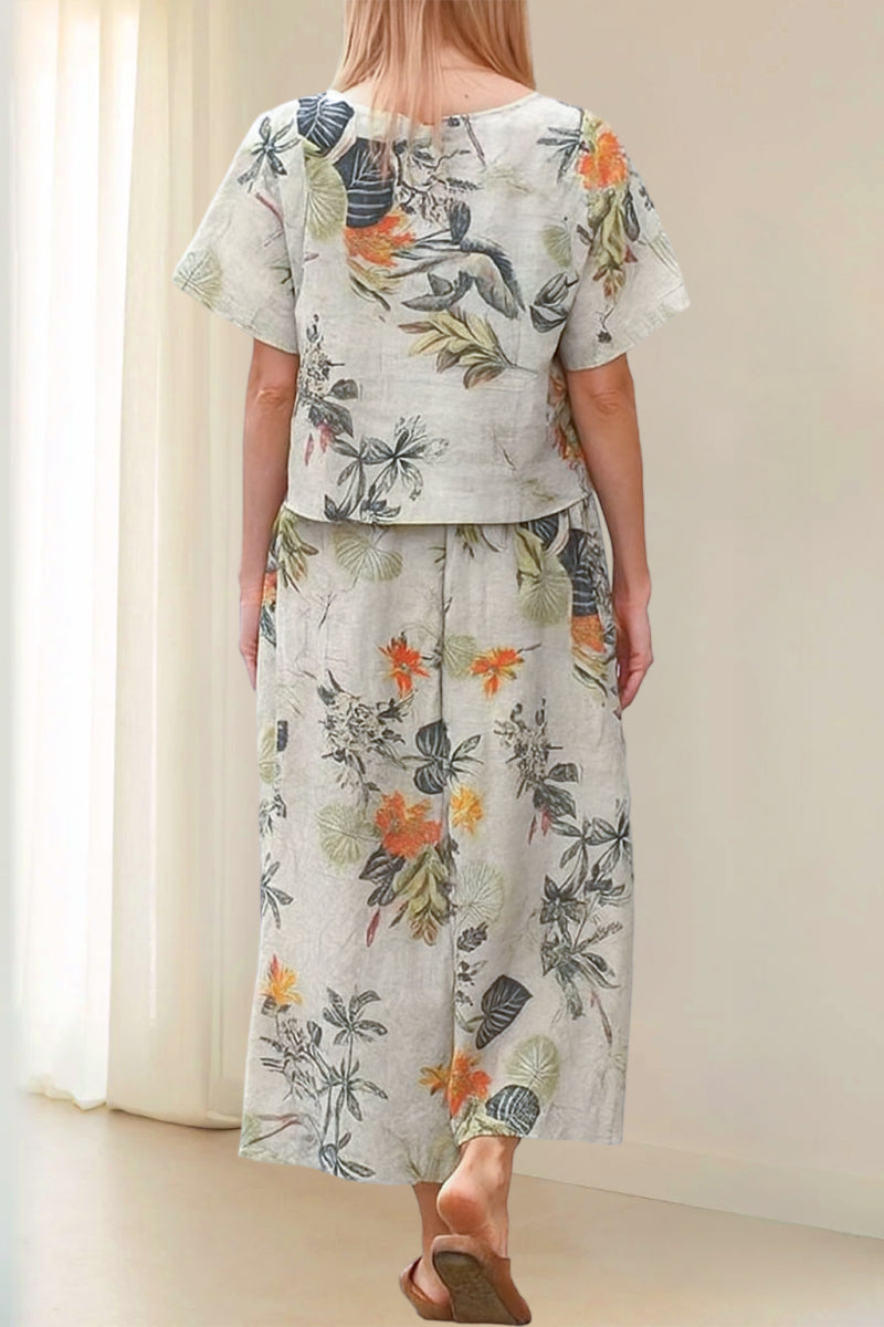 Linen and Cotton Loose Floral Short Sleeves Two-Piece Set