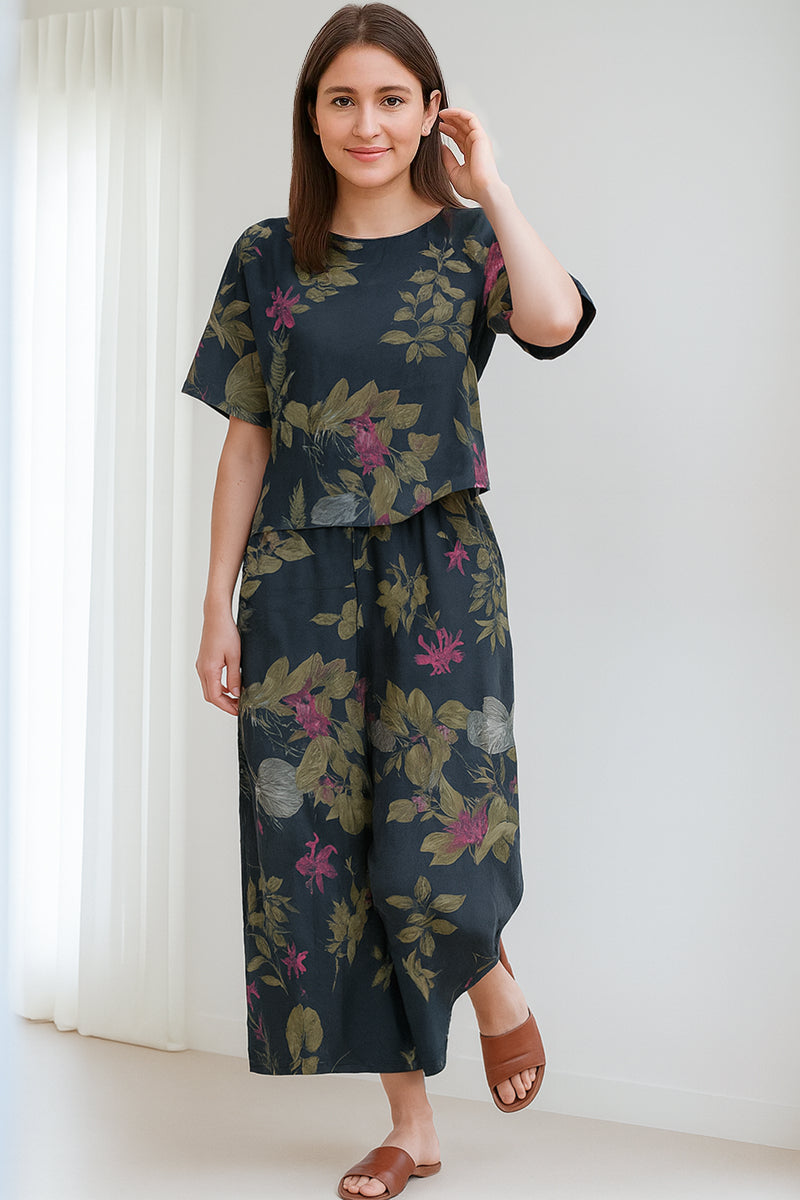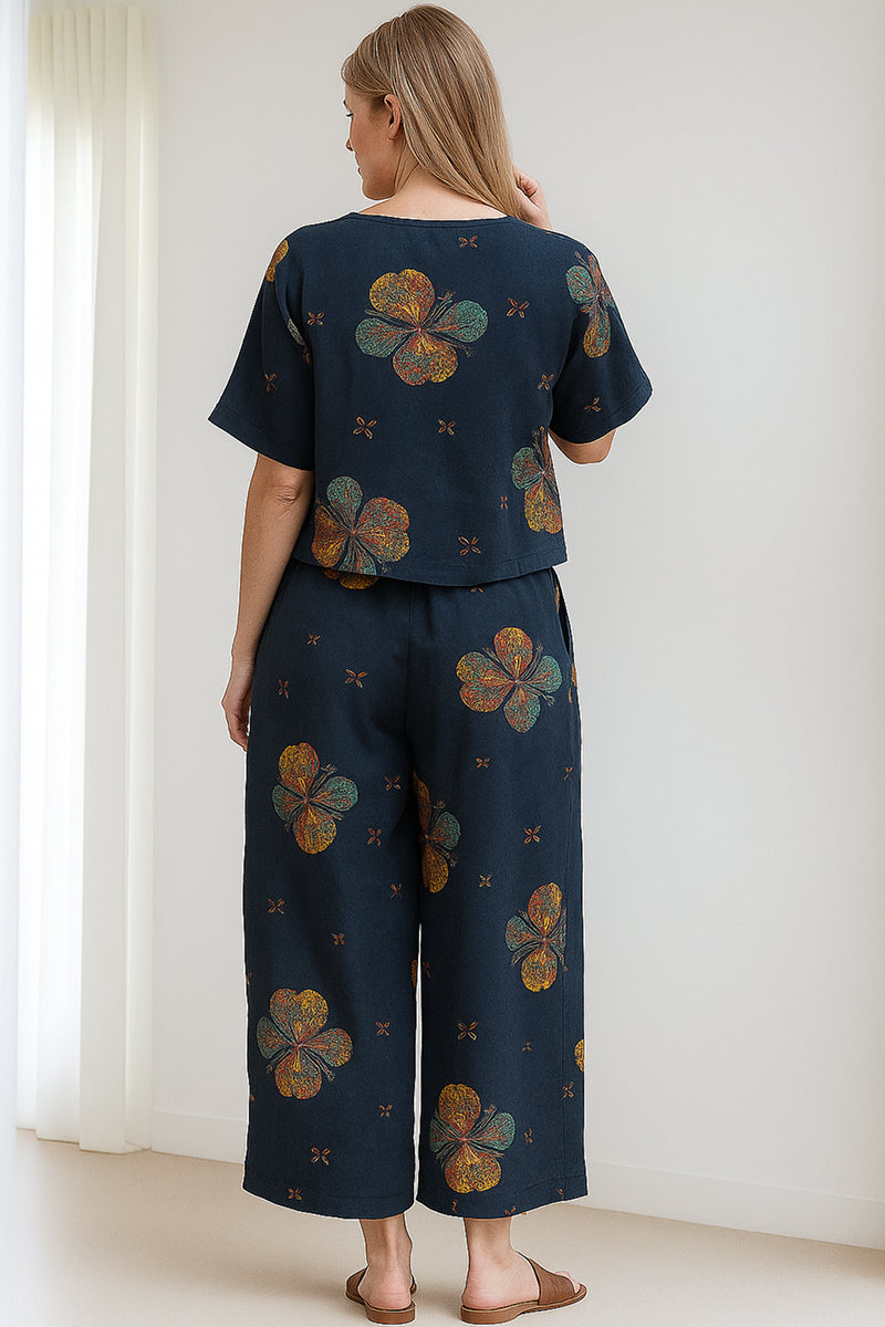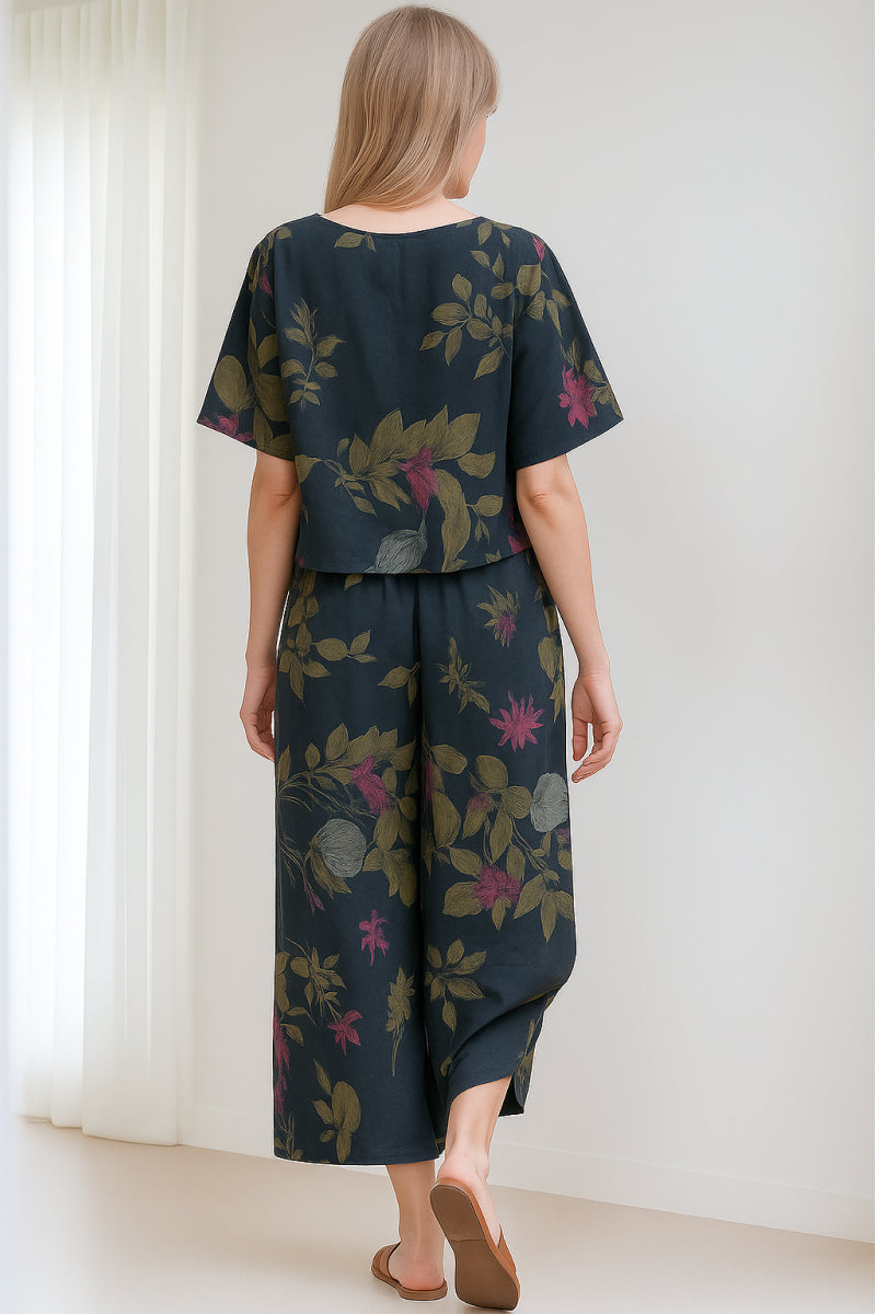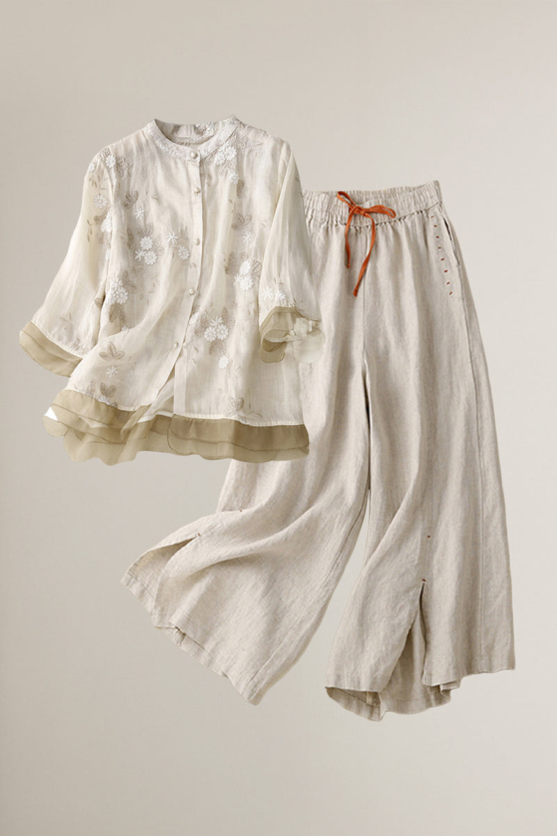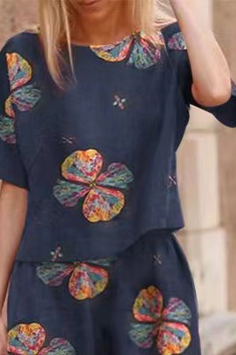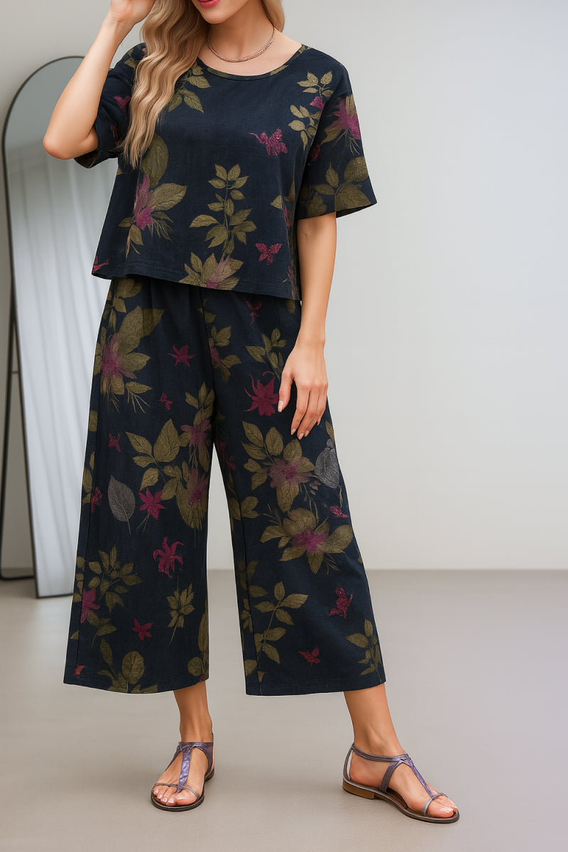 Linen and Cotton Loose Floral Short Sleeves Two-Piece Set