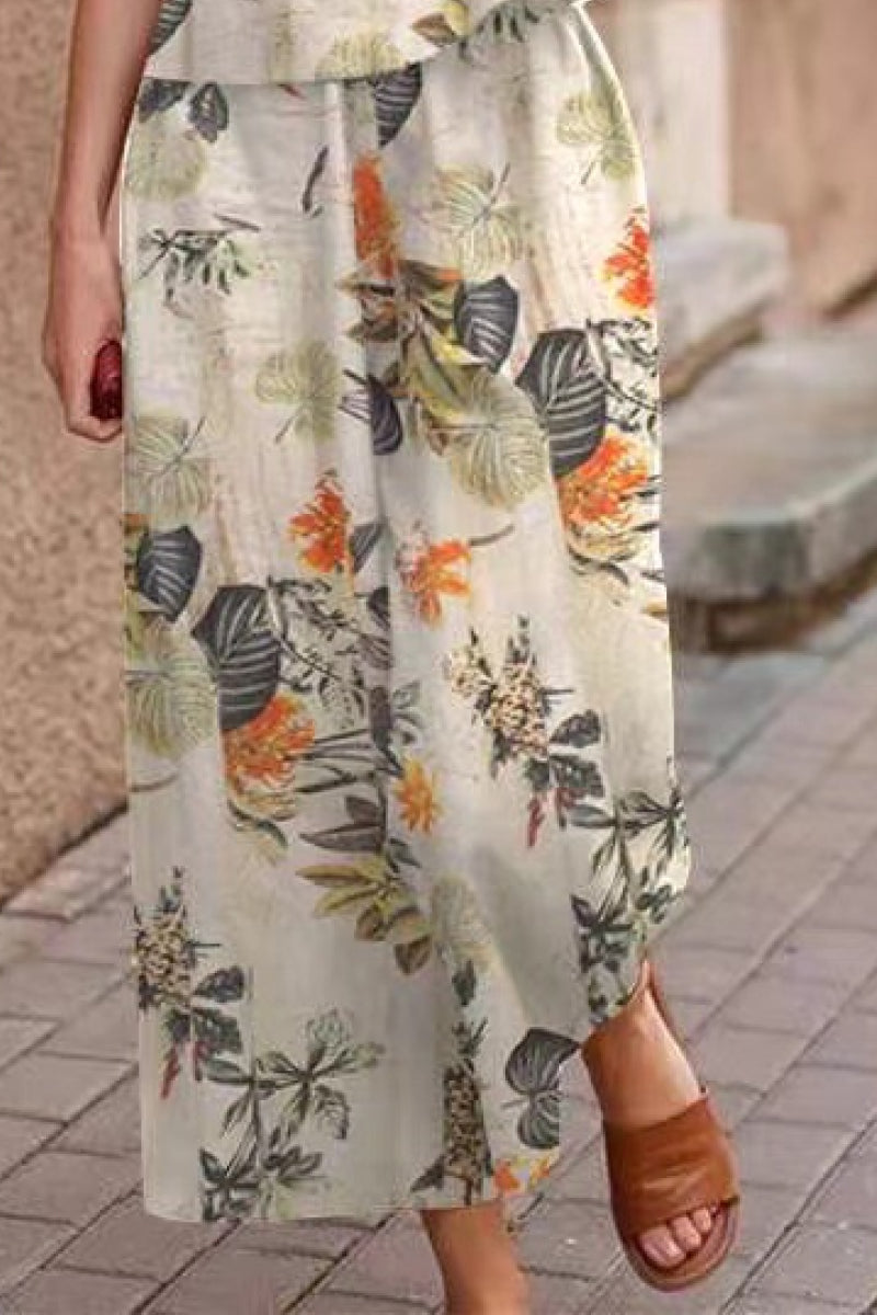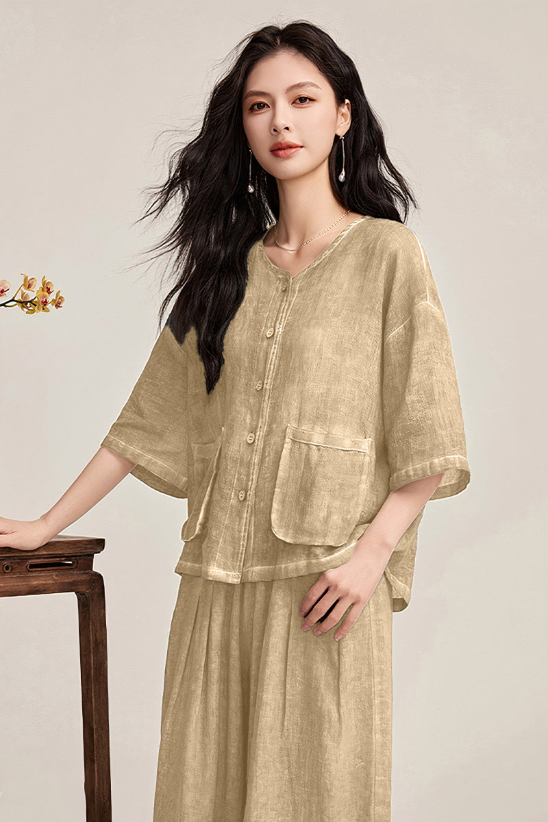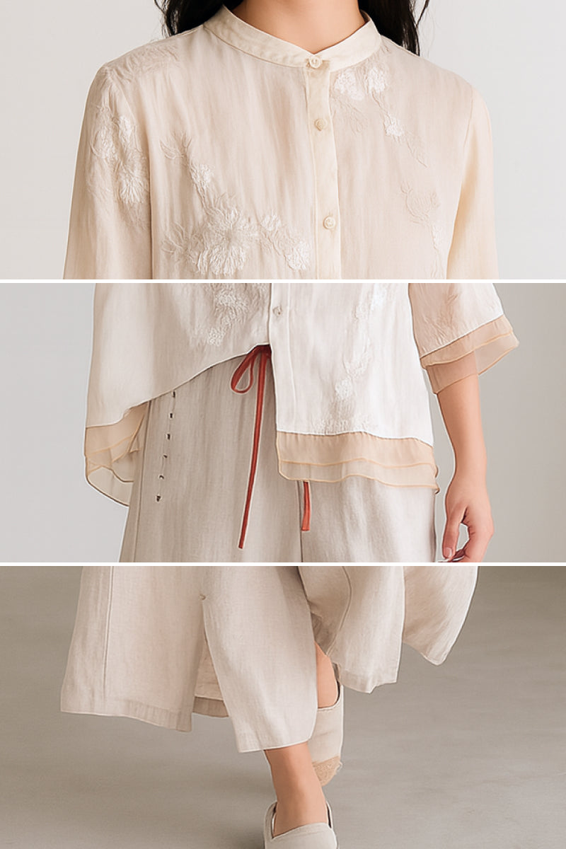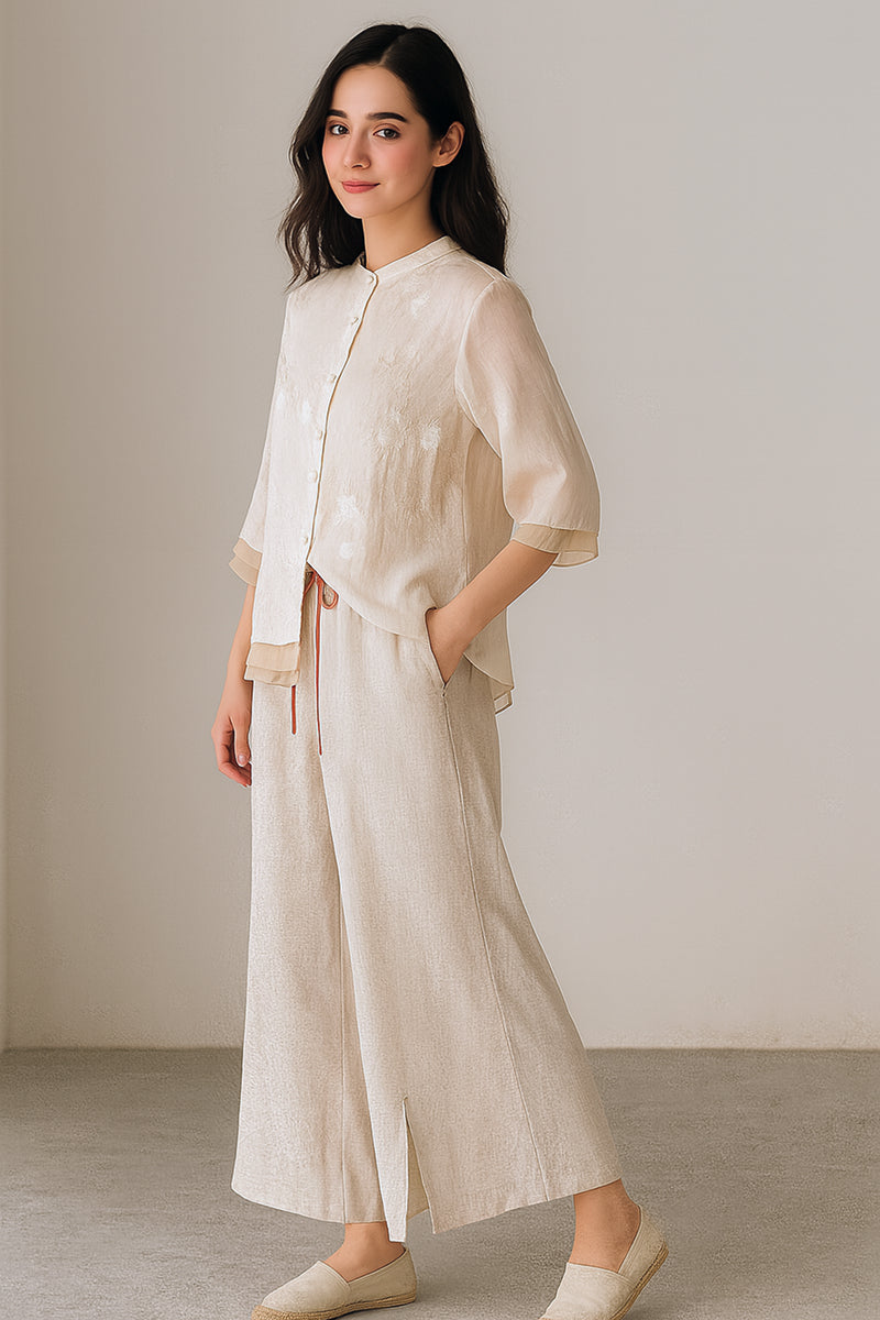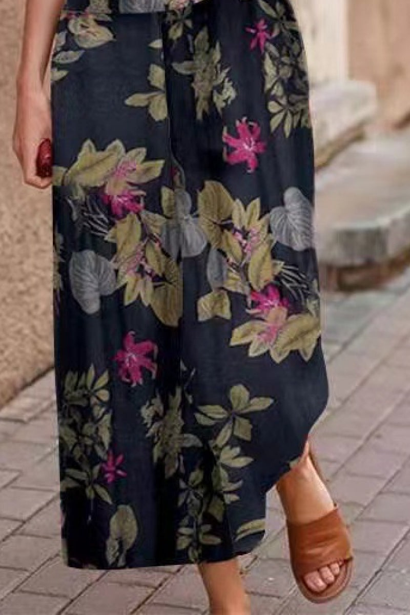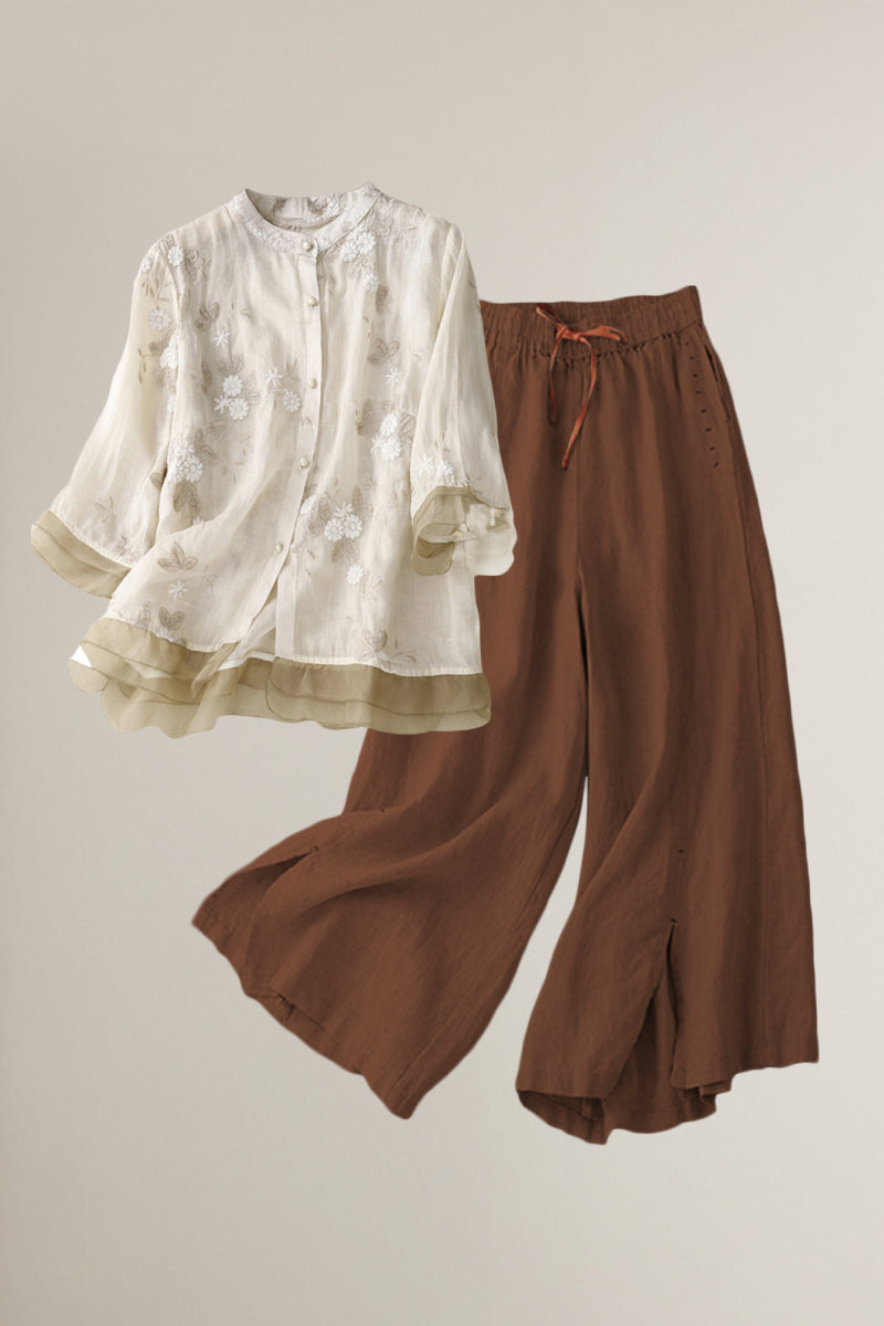 Linen and Cotton Loose Floral Short Sleeves Two-Piece Set