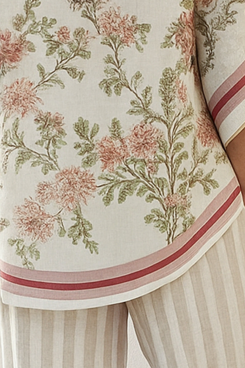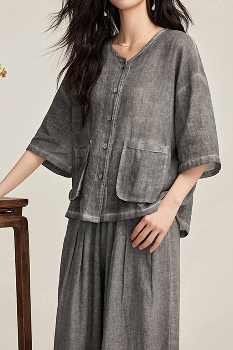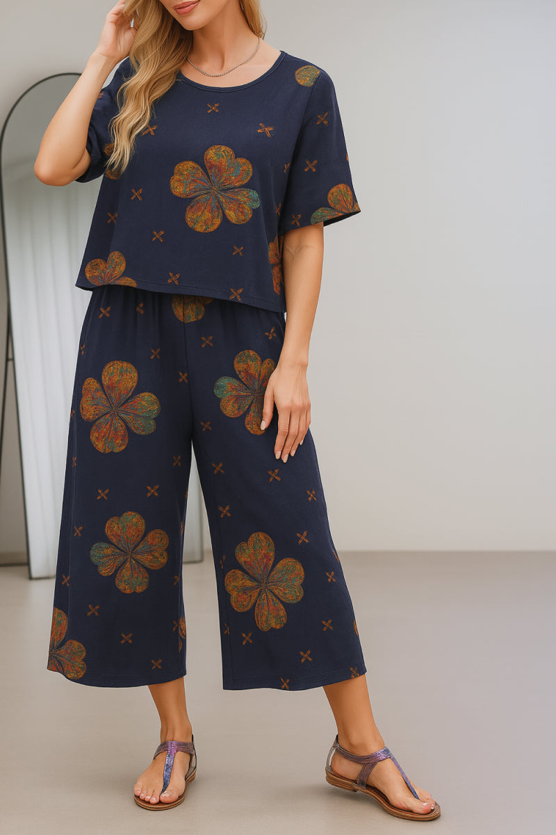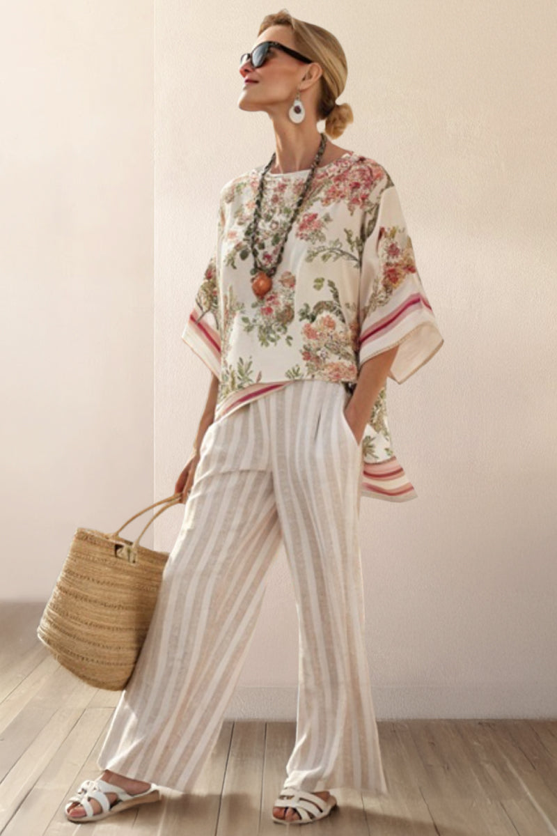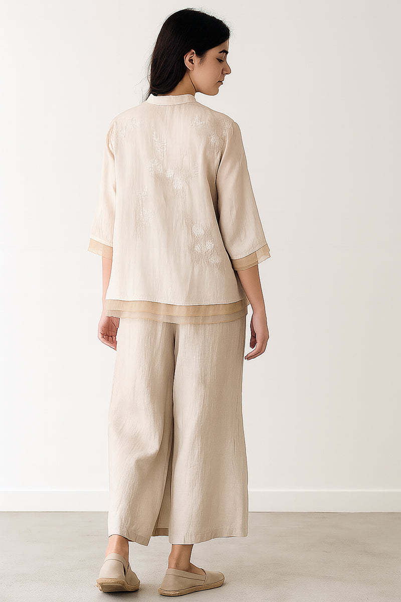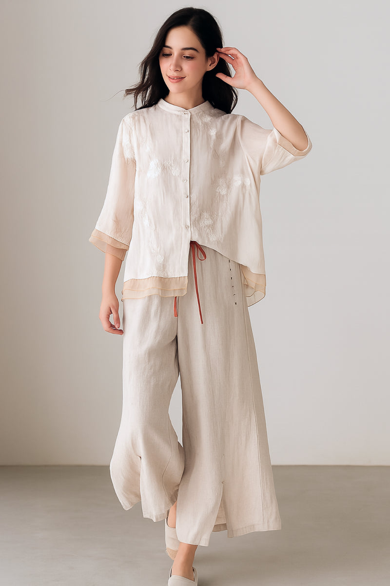 Linen and Cotton Loose Floral Short Sleeves Two-Piece Set