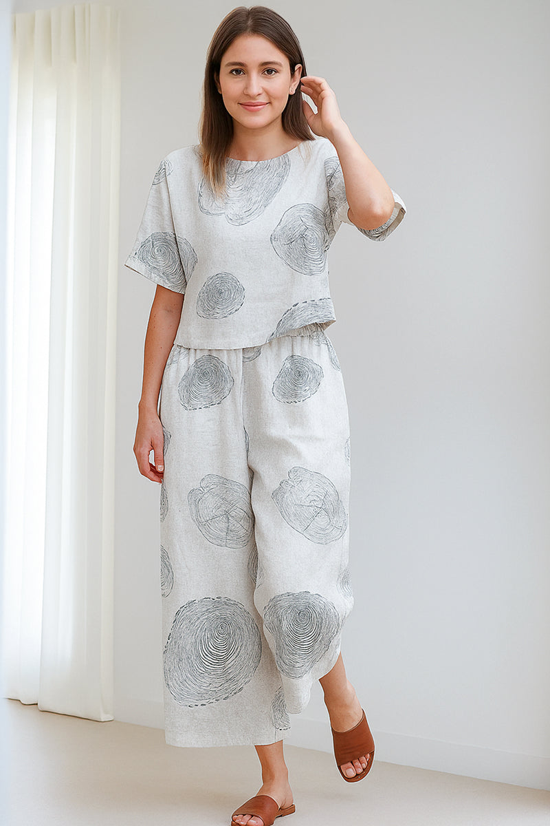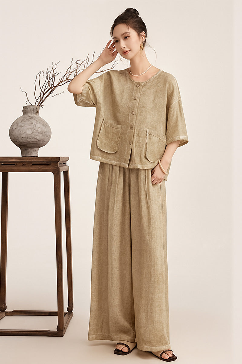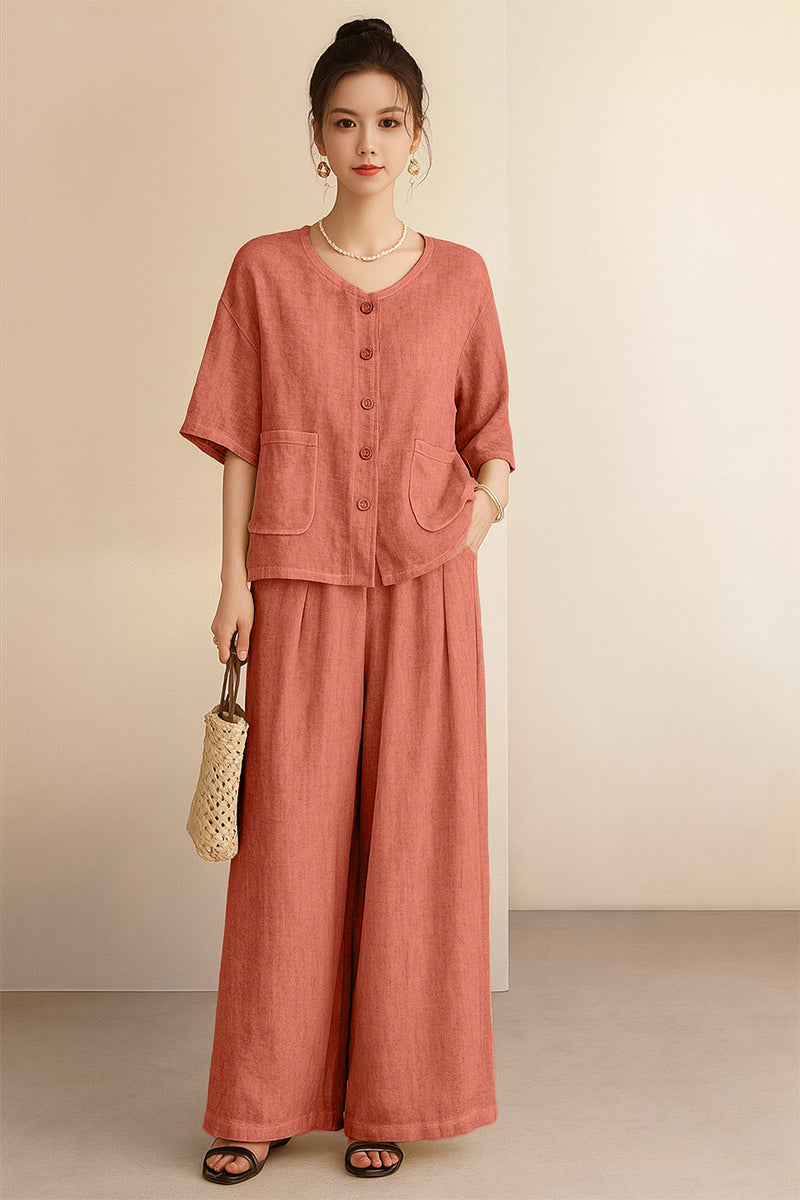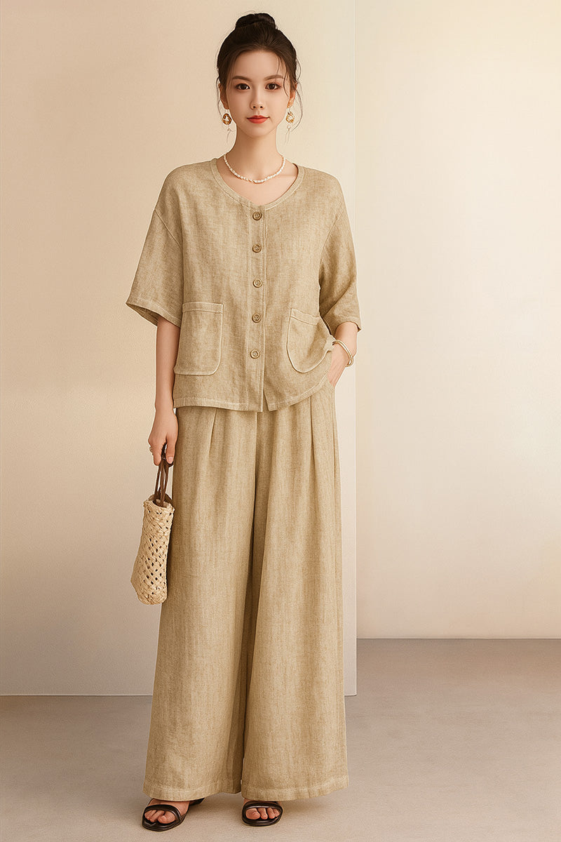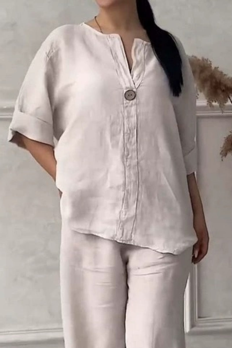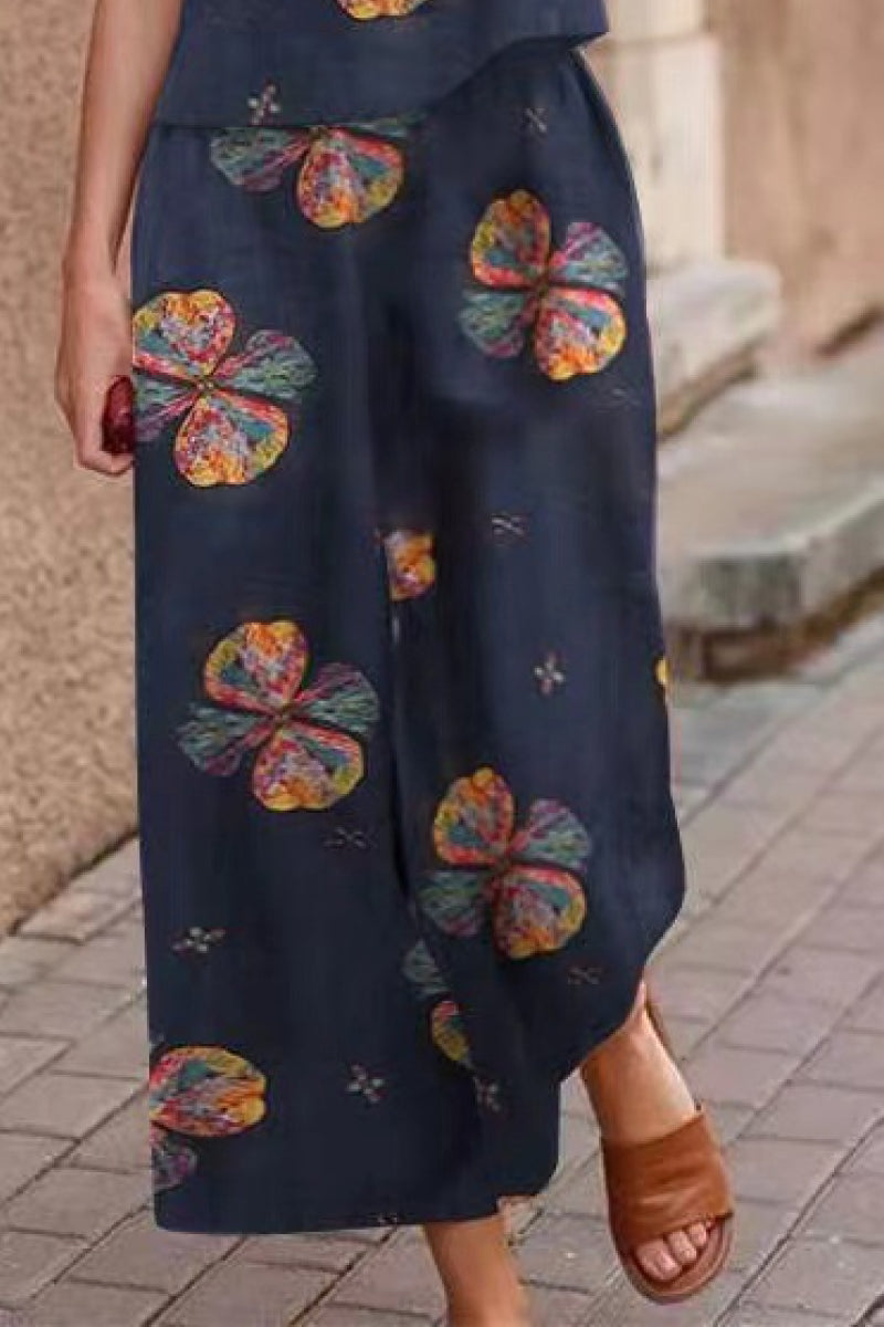 Linen and Cotton Loose Floral Short Sleeves Two-Piece Set