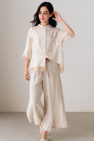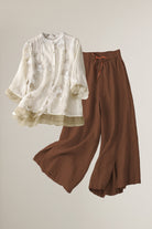 The embroidered top is sheer yet structured, with a soft layered hem. The wide-leg linen-blend trousers offer easy elegance, whether you’re wandering cobbled streets or unwinding on the terrace.